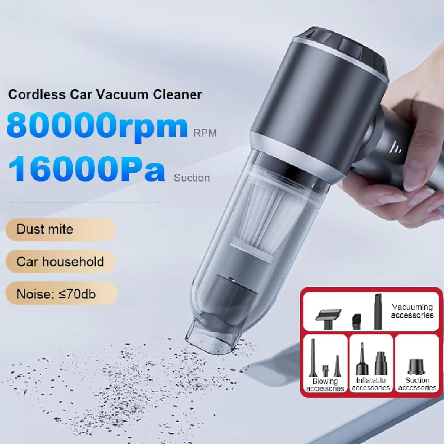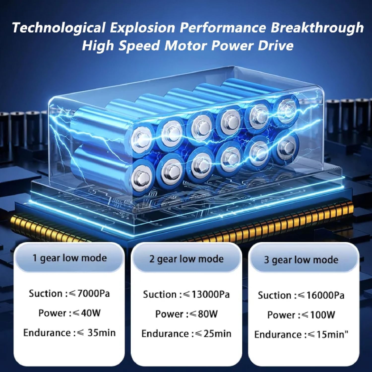 L’aspirateur de voiture rechargeable est doté d’une technologie de moteur sans balais de pointe, atteignant jusqu’à 80 000 tr/min et délivrant une puissance d’aspiration de 16 000 PA. Par rapport aux moteurs traditionnels, la conception sans balais offre une aspiration plus forte, des performances améliorées et une durée de vie plus longue.cet aspirateur de voiture à main vous permet de nettoyer les poils d’animaux, les mi